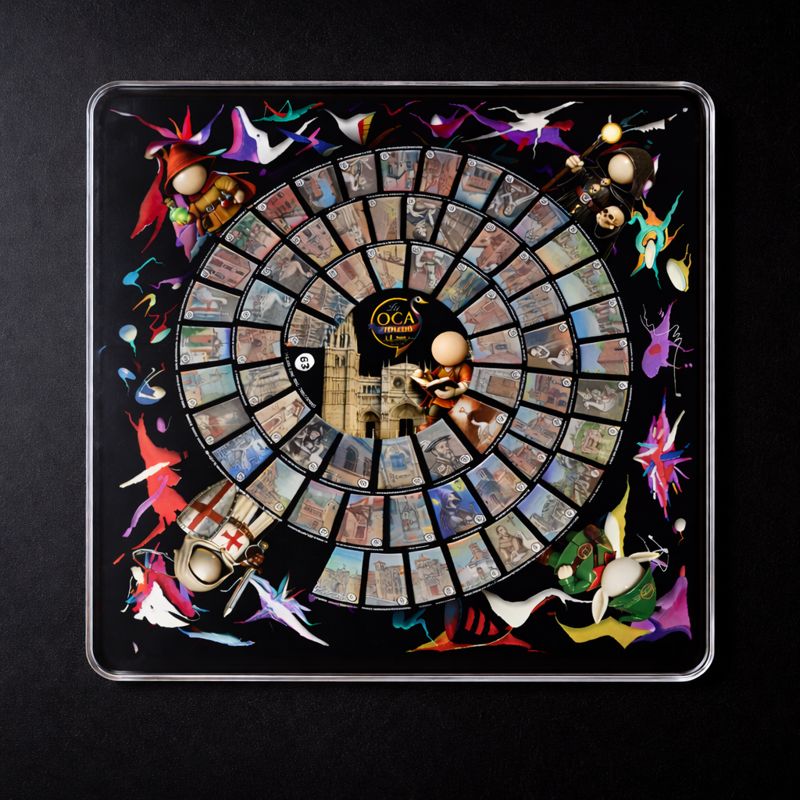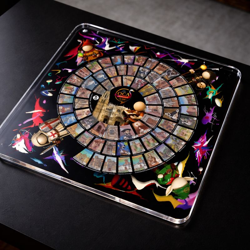 El conjunto se articula en torno a un tablero en metacrilato de alta calidad de 50×50 cm , que reproduce fielmente la obra original de La Oca de Toledo, incluyendo la Catedral de Toledo en volumen 3D, convertida en la casilla 63 y destino final del recorrido. El metacrilato aporta profundidad, brillo y una resistencia pensada para un uso duradero, elevando el tablero a la categoría de objeto artístico.