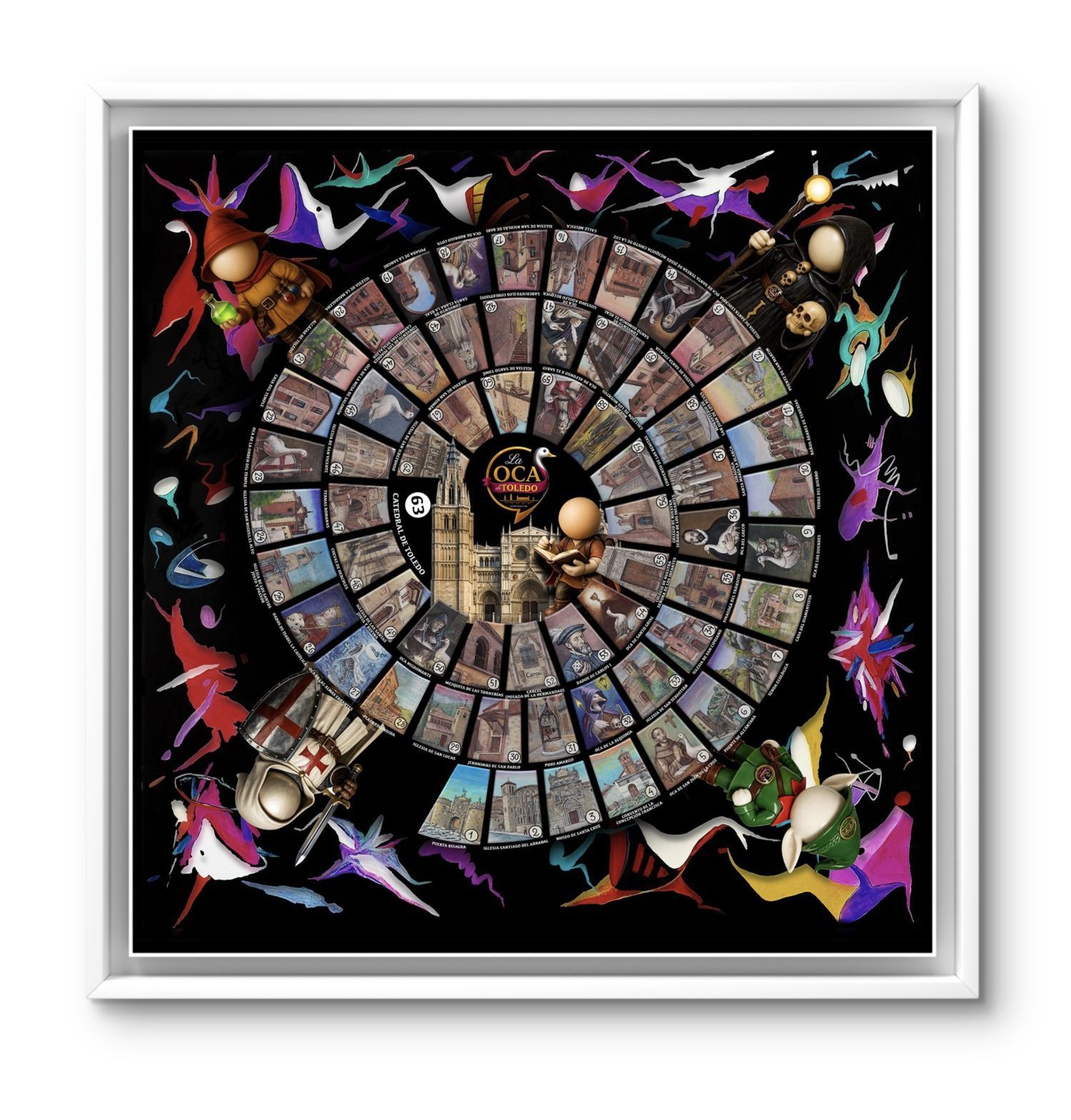 La edición Fine Art respeta fielmente la composición de La Oca de Toledo, trasladando el espíritu del tablero, sus recorridos y su iconografía a un soporte pensado para su exhibición en espacios privados, galerías o instituciones.