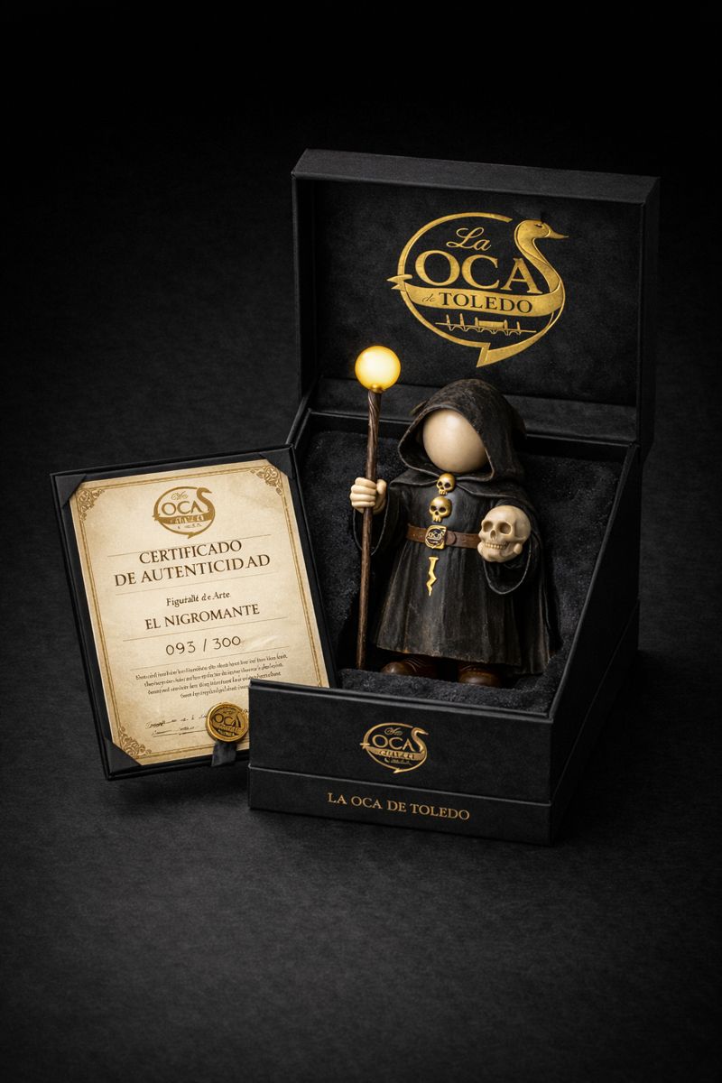 El Nigromante de la Oca de Toledo es una obra de arte creada para coleccionistas que valoran lo auténtico. Inspirada en la tradición esotérica y el legado hermético de la ciudad de Toledo, esta figura representa al guardián del conocimiento oculto y de los saberes ancestrales que hicieron de Toledo un referente místico universal.